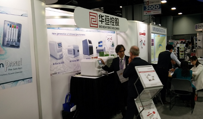 华亘多年参与DDW,展示幽门螺杆菌检测系列产品:碳13呼气试验设备及试剂,多肽抗原检测卡;以及欧洲子公司生产的结肠疾病检测卡Colon Panel。历时4天的展览,华亘新老国际客户到展台交流技术及商务,DDW已经成为华亘与国际客户交流的一个品牌平台。此外,中国有超过100位消化专家参与会议,全程与华亘公司员工进行了深入、全面的沟通。